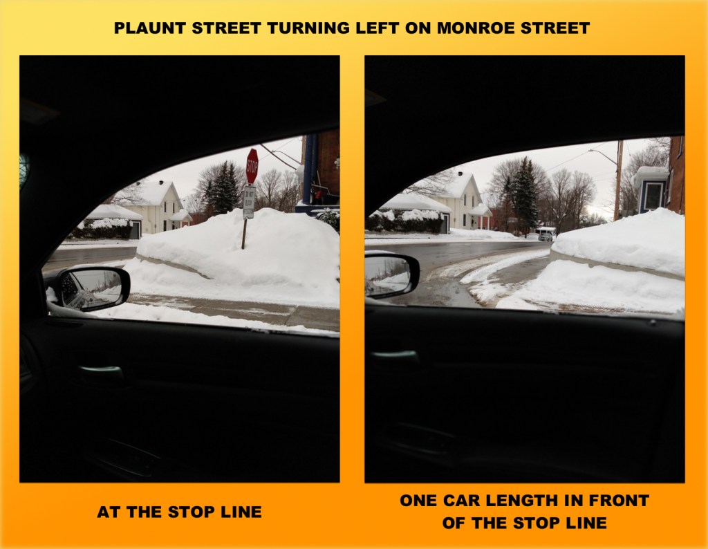 After nudging forward, then nudging forward again, then another nudge with your head on a swivel, guess where you find yourself? In the middle of the intersection, that’s where. And you still can’t see traffic coming at you from your right. Meanwhile, motorists approaching from the left on Monroe are wondering what in the hell you’re doing in the middle of the intersection, often leading to horns and fingers being brandished.