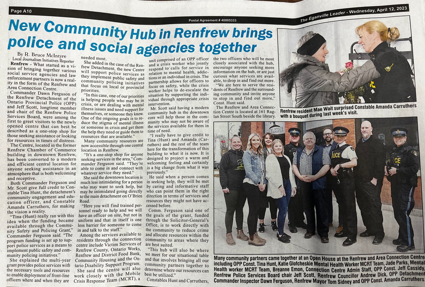 The Renfrew and Area Connections Centre is closing, effective Friday. The fellow issuing the statement on behalf of Renfrew OPP, Inspector Marc Hemmerick, used the word “pause” in an emailed statement given to Renfrew’s myFM radio. I have to crib the statement from their online site because, well, Inspector Hemmerick obviously doesn’t feel I’m worth responding to, having failed to return my call placed last week with the detachment seeking comment on this very topic