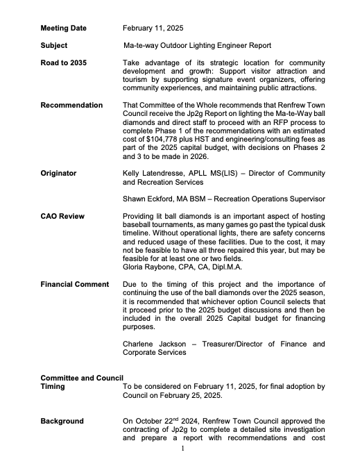 The options, as you may well imagine, include fixing one, two, or all three fields and have the costs charged to the 2025 municipal budget, or delayed until the 2026 budget. If you were thinking that Renfrew was a little short of money in recent times, then you’d be more than correct. The 2025 budget is likely to be an unpopular one among town ratepayers because of increases already built-in as a result of Ma-Te-Way being incredibly over-budget, not to mention budget overages for the Town Hall renovation and the various road-construction projects where the horse got away from the rider.