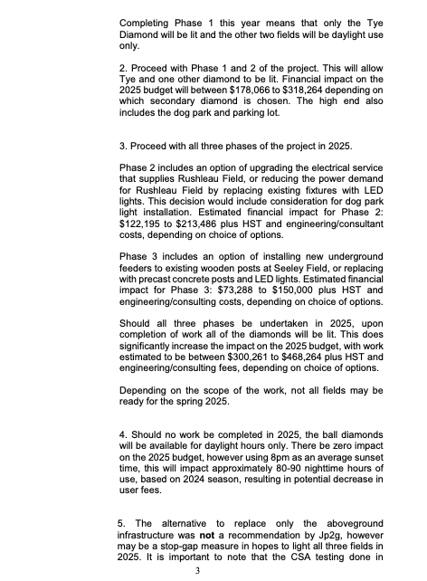 Jp2g has recommended what they refer to as Option 1, which involves getting one field, that being Tye Field, up and running and leaving the other two for 2026. This is also known as NADO — Not Andrew Dick Option — who has said on record that, although money’s tight, there’s enough of it around that can be squeezed out of the system and thrown towards keeping local ballplayers happily scrambling about in the infield dirt as daylight fades and the darkness falls. This option, or Phase 1, carries a price tag of $104,778 plus HST.