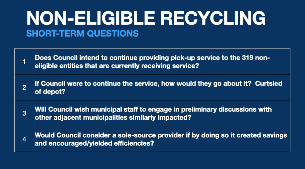 Councillor McDonald asked if the ineligible stuff could be limited to a downtown pick-up service, where I suppose the rest of the non-eligible types can just go pound some sand. Manager Springer noted that Smith’s Falls does this, but she was of the opinion that any savings hoped for from such a partial service, including Raglan Street, O’Brien Road, and Stewart Street corridors, would be negligible.