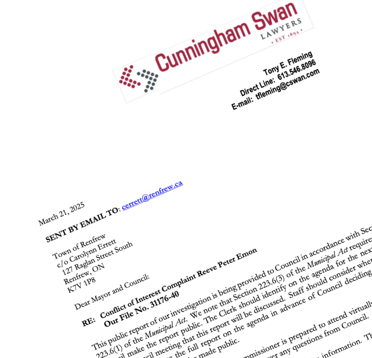 During the past Council meeting, much-ignored Integrity Commissioner Tony Fleming weighed in on the latest charge facing Reeve Emon, that being that he allegedly violated a conflict of interest rule by voting on a motion pertaining to his removal from Council-directed boards and committees.