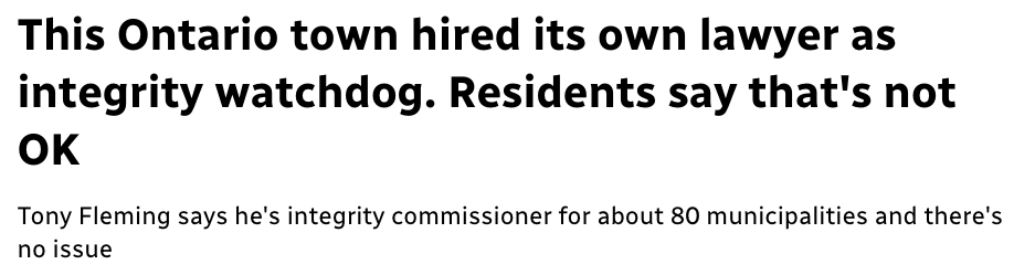 The Council and the Town Administration control all aspects of the transparency process, including the naming and hiring of the very integrity commissioner who would be tasked with looking into complaints.