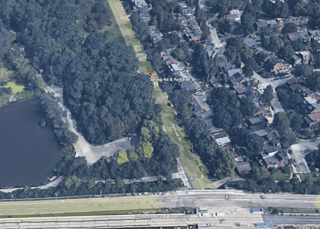The camera has been positioned on Parkside Drive, at the edge of a part of town known as High Park. This stretch of road traverses a residential area, but that’s of no consequence to the thousands of motorists who use it as a short-cut from one point to another, many of them barrelling through the neighbourhood at highway speeds.