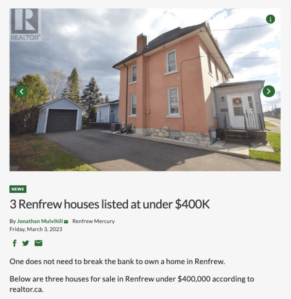 March 3rd saw an article in the online version of the paper talking about how there are homes available in Renfrew that won’t break the bank with prices under $400,000. The article then went on to describe three such homes, with descriptions that one would see on the website of a real estate company. That shouldn’t be a big surprise since the primary source was a website, realtor.ca.