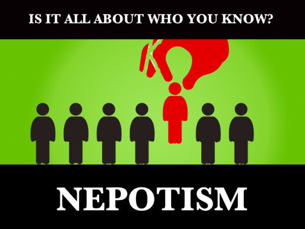 Nepotism is generally regarded as the practice of hiring or favouring relatives over others.  It’s using personal influence, even power within an organization, to give a friend or family member a leg-up when it comes to an opportunity.